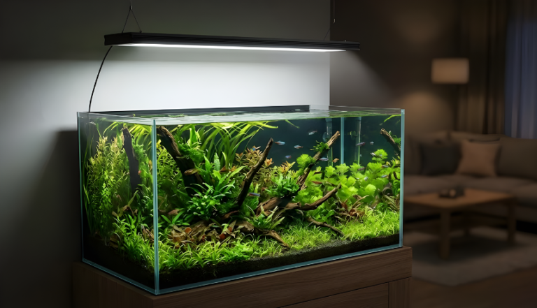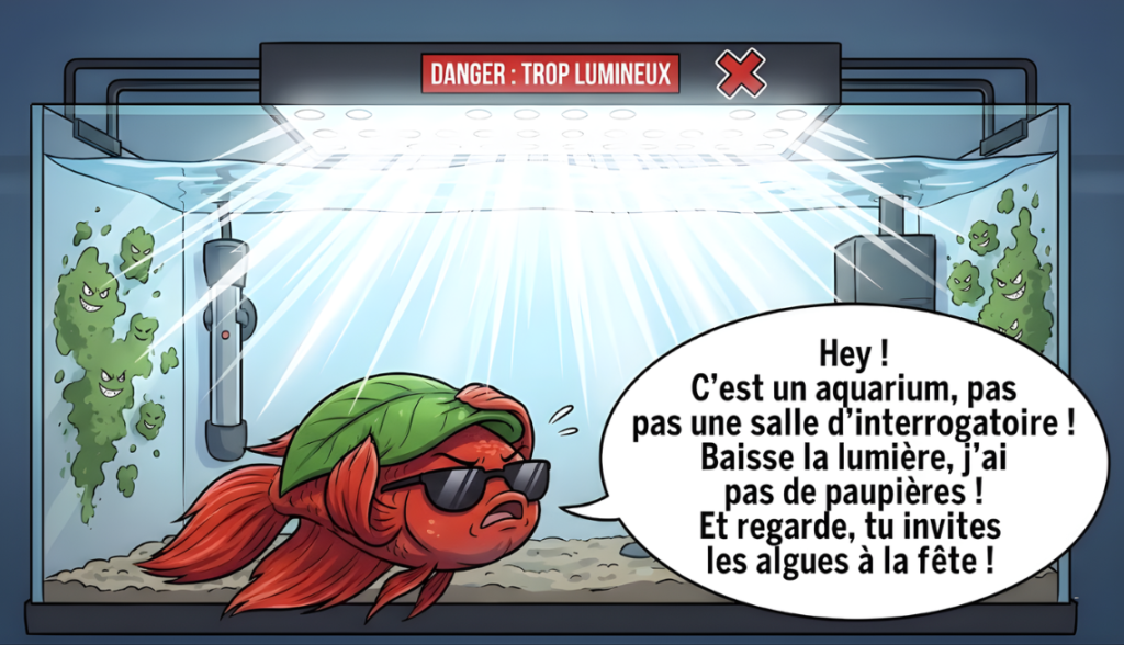 La lumière est essentielle pour la photosynthèse de vos plantes et pour caler l’horloge biologique de votre poisson (cycle jour/nuit). Mais attention : c’est l’élément le plus difficile à doser. Un excès, en durée ou en puissance, est le déclencheur n°1 des catastrophes.