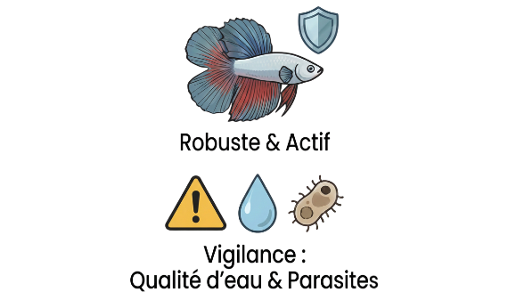 Taillé pour la survie, le Plakat est le Betta le plus résistant. Son corps massif et ses nageoires courtes ne s’épuisent pas et sont bien moins sujets aux déchirures ou pourritures que les longs voiles. C’est un poisson solide qui tombe rarement malade si son eau est propre et chauffée. L’allié idéal pour une maintenance sereine.