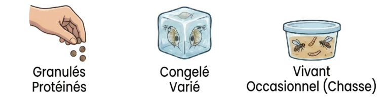 • Chasseur Actif : Il est plus rapide que les autres. N’hésitez pas à lui donner du vivant (Daphnies, Artémias) ou des insectes à chasser pour stimuler son instinct de prédateur.